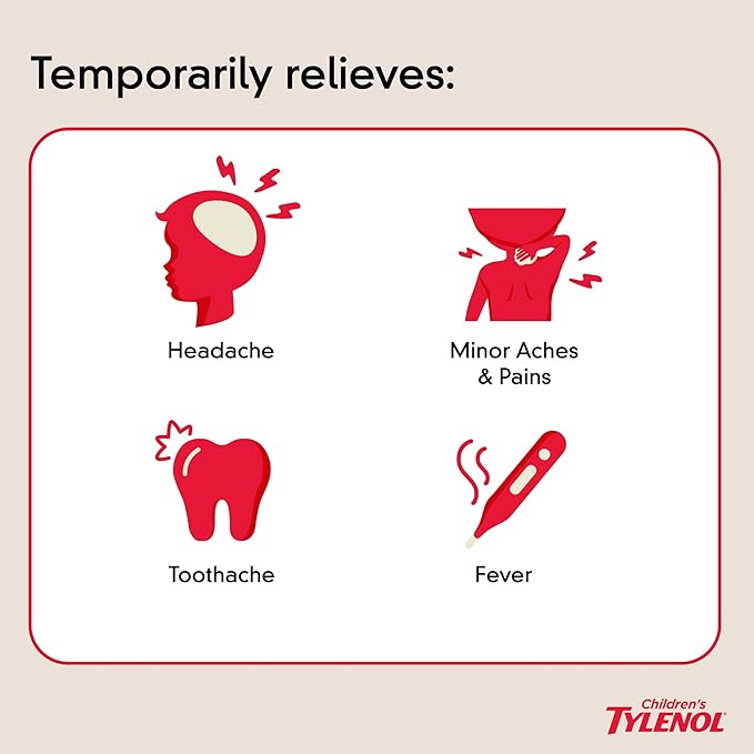 - 24-count of Children's Tylenol Chewable Tablets with acetaminophen works to temporarily relieve minor aches and pains as well as cold and flu symptoms in children, including sore throat, headache and fever
